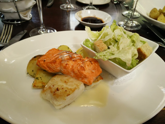 We had other food as well though. My main was the Today's Grilled Duo of Fresh Fish $28.95, which was a sablefish and salmon, with Caesar Salad.